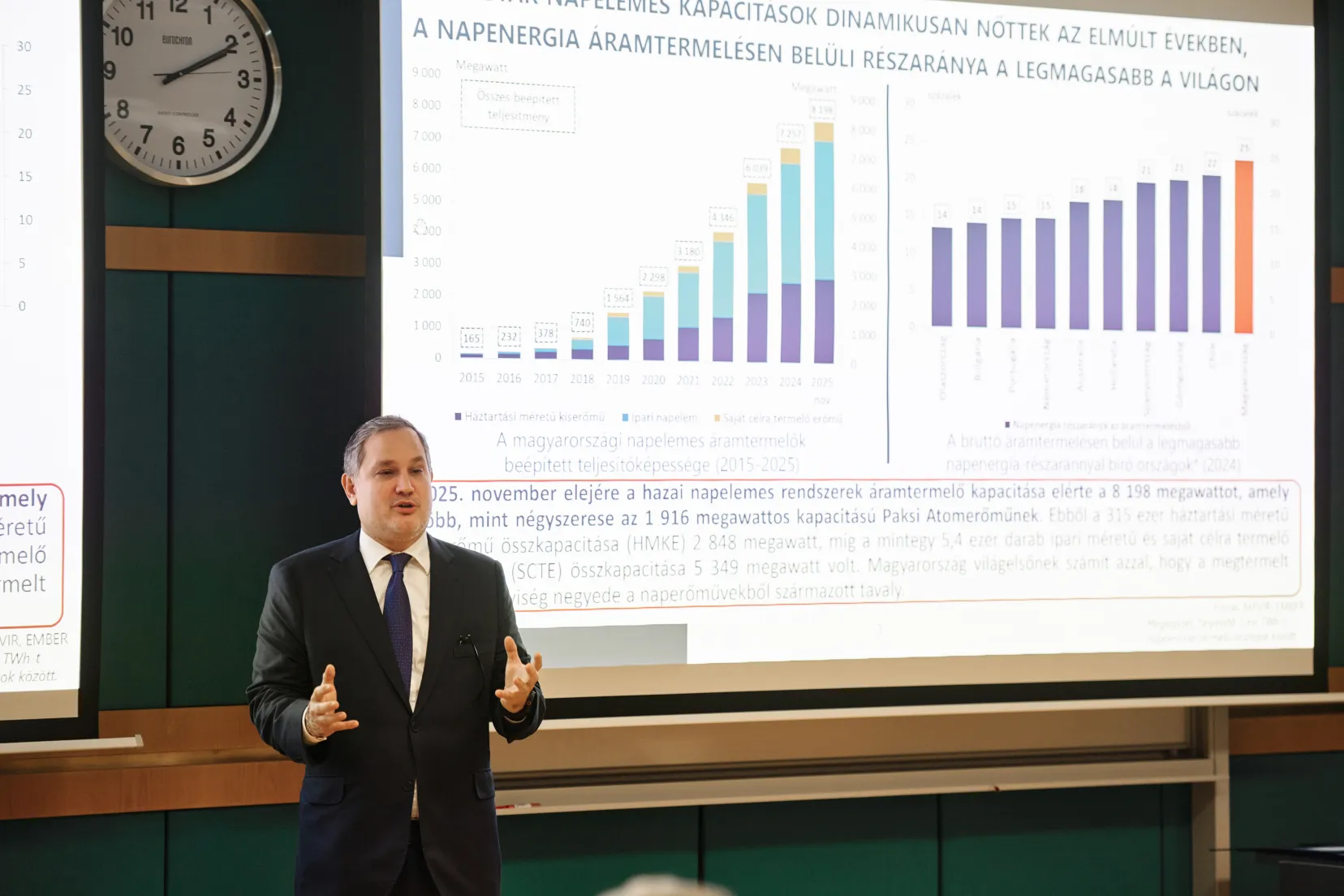 Nagy Márton miniszter "A zöld energia következő kulcslépése az akkumulátoros tárolókba történő beruházás" c. előadásában kiemelte, hogy a jövőben a globális versenyben a versenyképesség az adórendszer mellett azon fog múlni, kinek van elérhető és megfizethető energiája. Ez alapkérdéssé válik, miközben a villamos energia iránti igény a jövőben tovább emelkedik. A hazai napelemes rendszerek áramtermelő kapacitása az elmúlt években dinamikusan nőtt, és 8200 megawattal több mint négyszerese a Paksi Atomerőmű kapacitásának - fogalmazott Nagy Márton megjegyezve, hogy a napenergia áramtermelésen belüli részaránya Magyarországon a világon a legnagyobb.